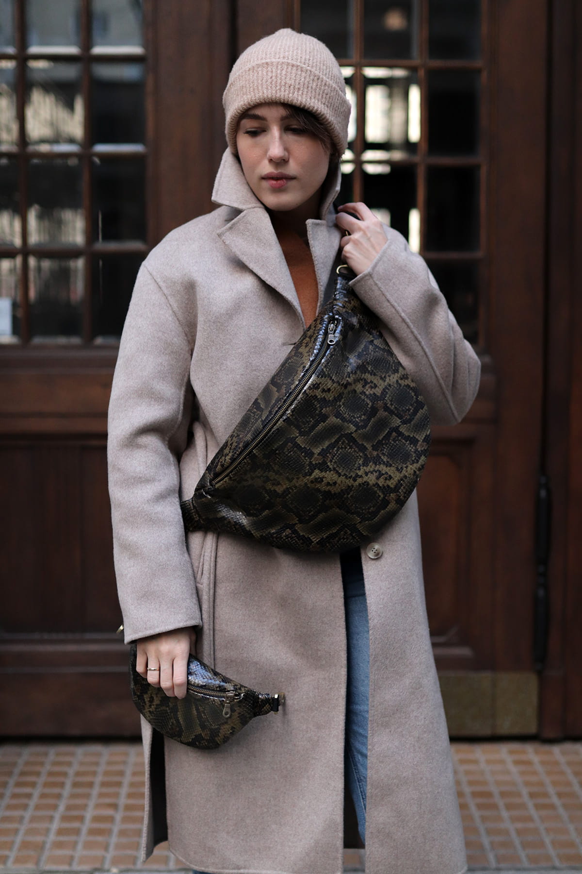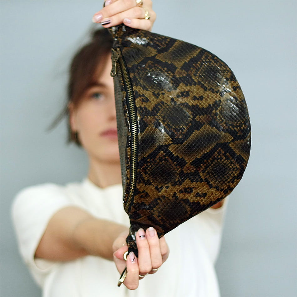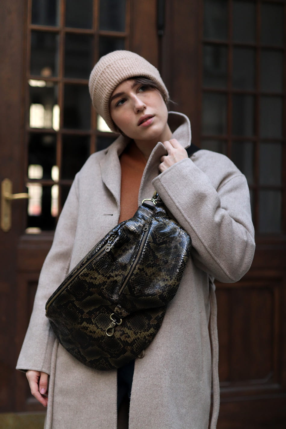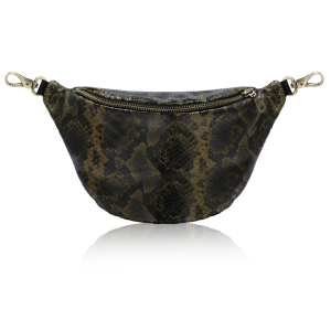Nerka unisex, dla Niej i dla Niego. Wykonana z powlekanej skóry naturalnej tłoczonej i drukowanej w zwierzęcy wzór, z metalowym zamkiem i pozostałymi okuciami w kolorze starego złota. Odcienie tego modelu to: khaki, ciemna zieleń i czerń. Jagoda prezentuje nerki w rozmiarach mini, traveller oraz midi na czarnym skórzanym pasku 2,5cm. Przypinaj ją karabinkami do szlufek dżinsów lub noś na regulowanych paskach.