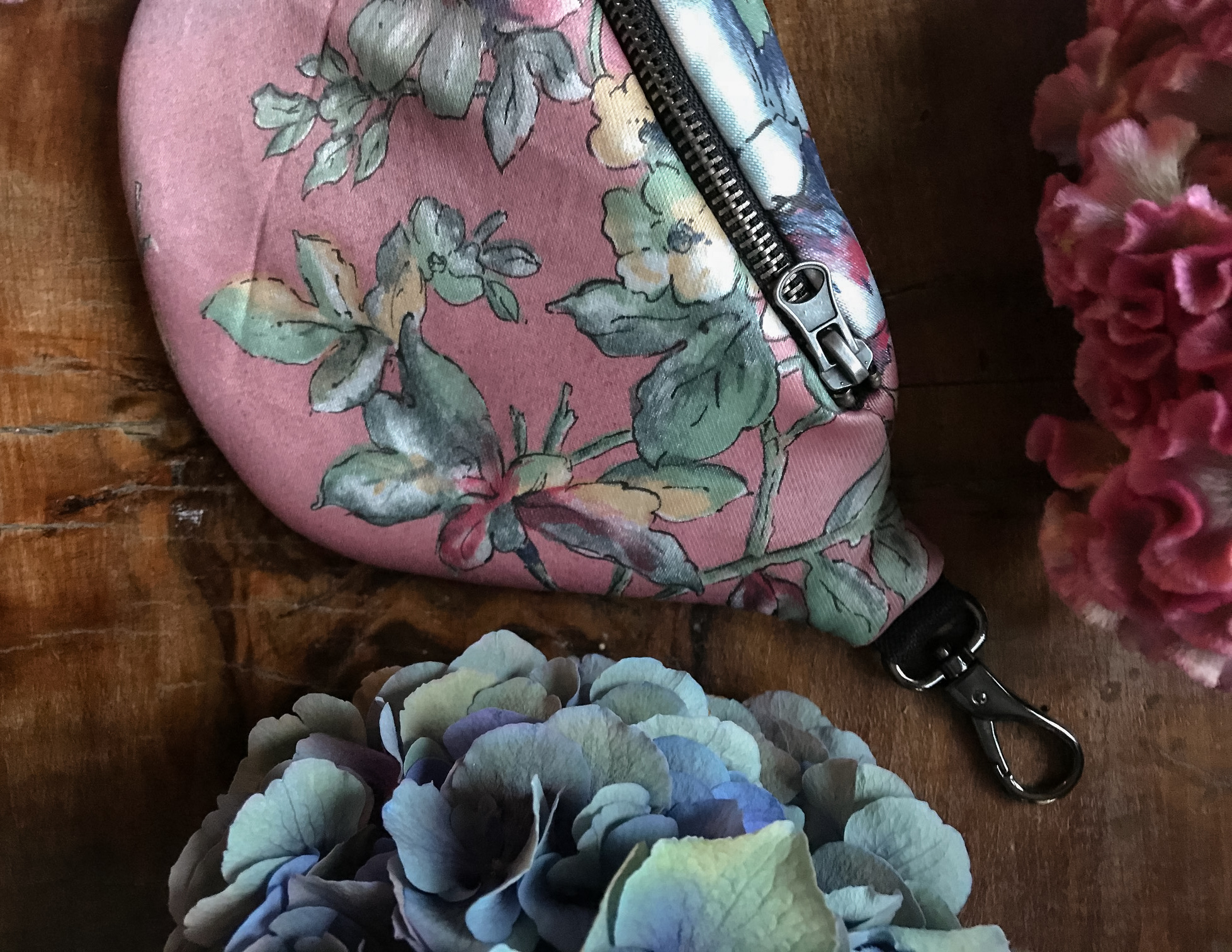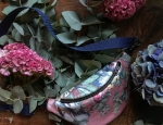 Ten model nerki z kolekcji Retro został uszyty z tkaniny recyklingowej. Tkanina w kolorze zgaszonego różu została ozdobiona kwiatami hortensji. Kompozycję kolorystyczną tworzą tu zgaszone zielenie oraz błękity.