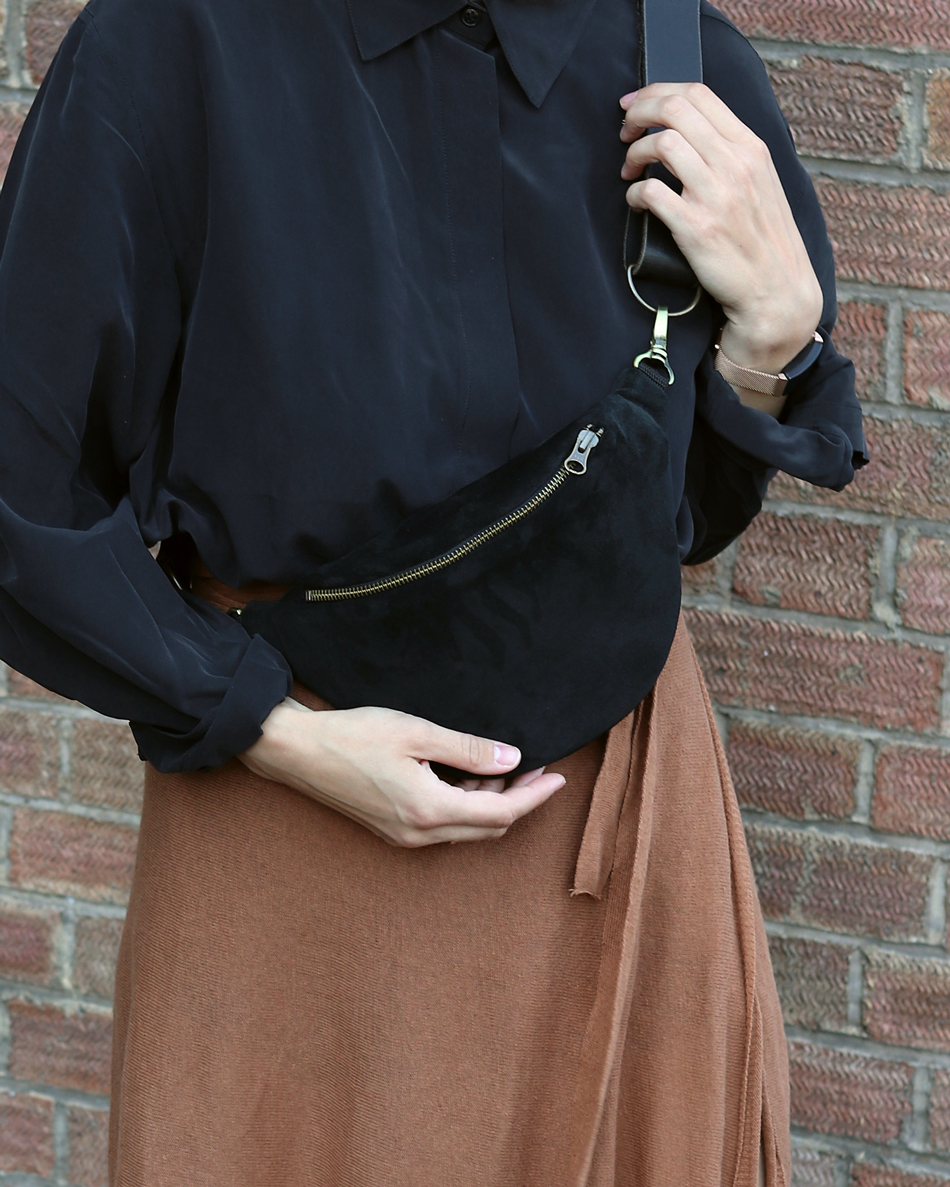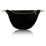 Czarna nerka handmade z zamszowej skóry naturalnej, z metalowym zamkiem i pozostałymi okuciami w kolorze starego złota. Kolor modelu Leather Suede Black to czerń.