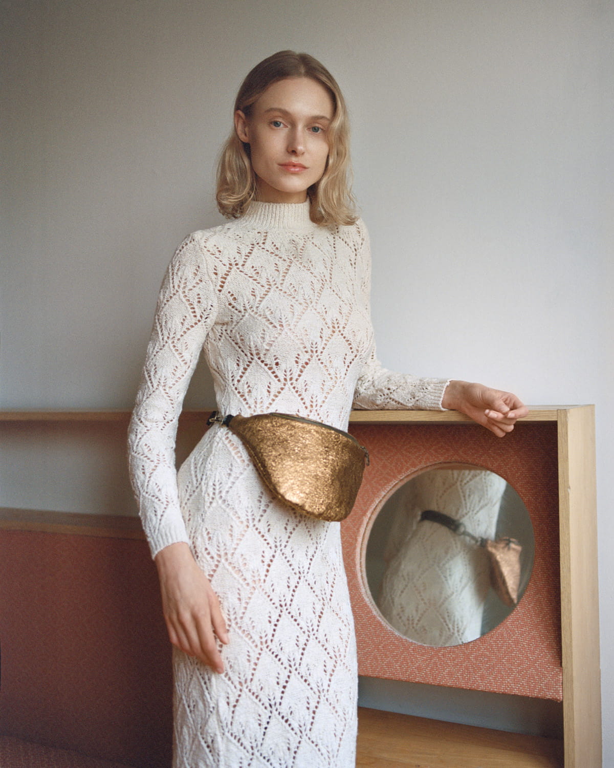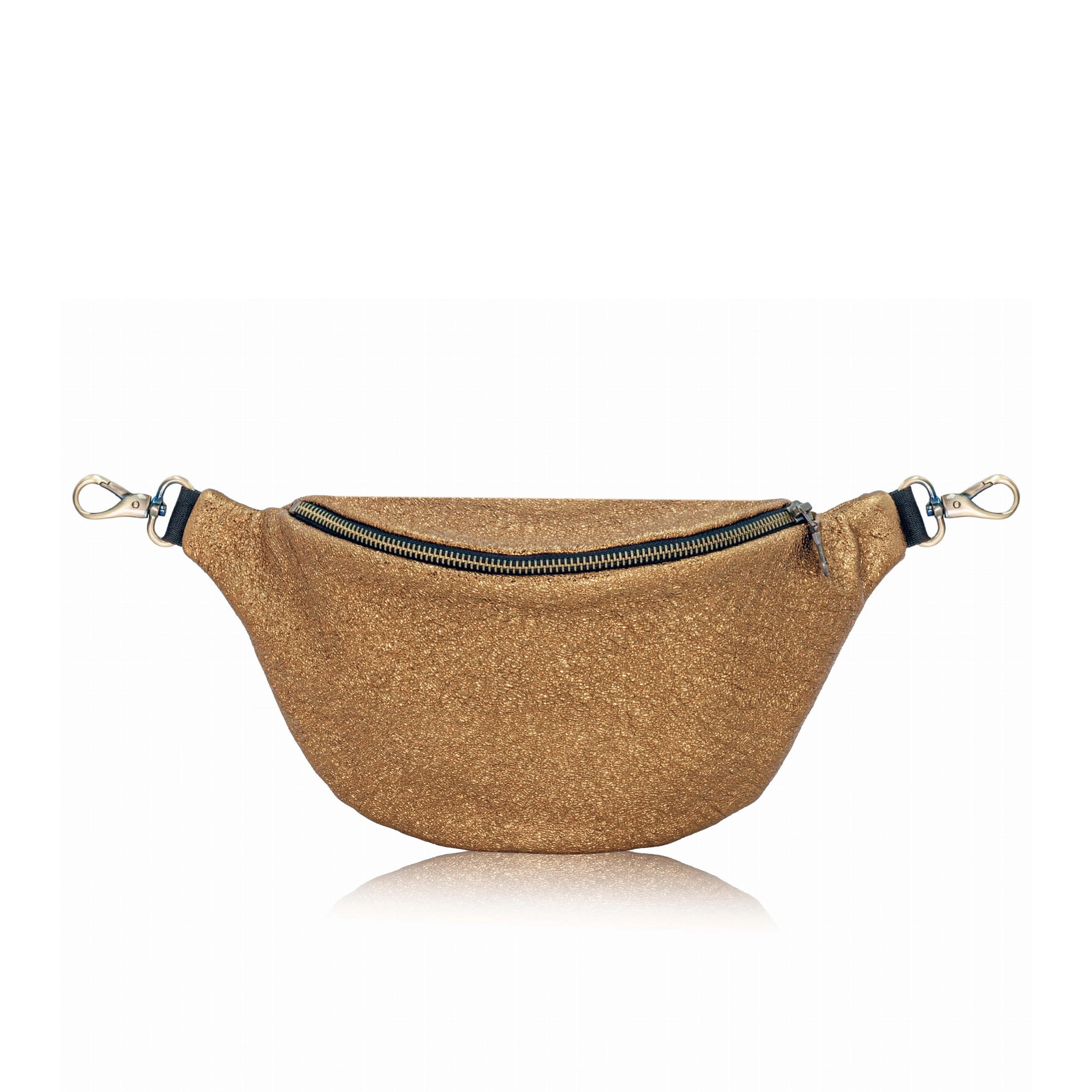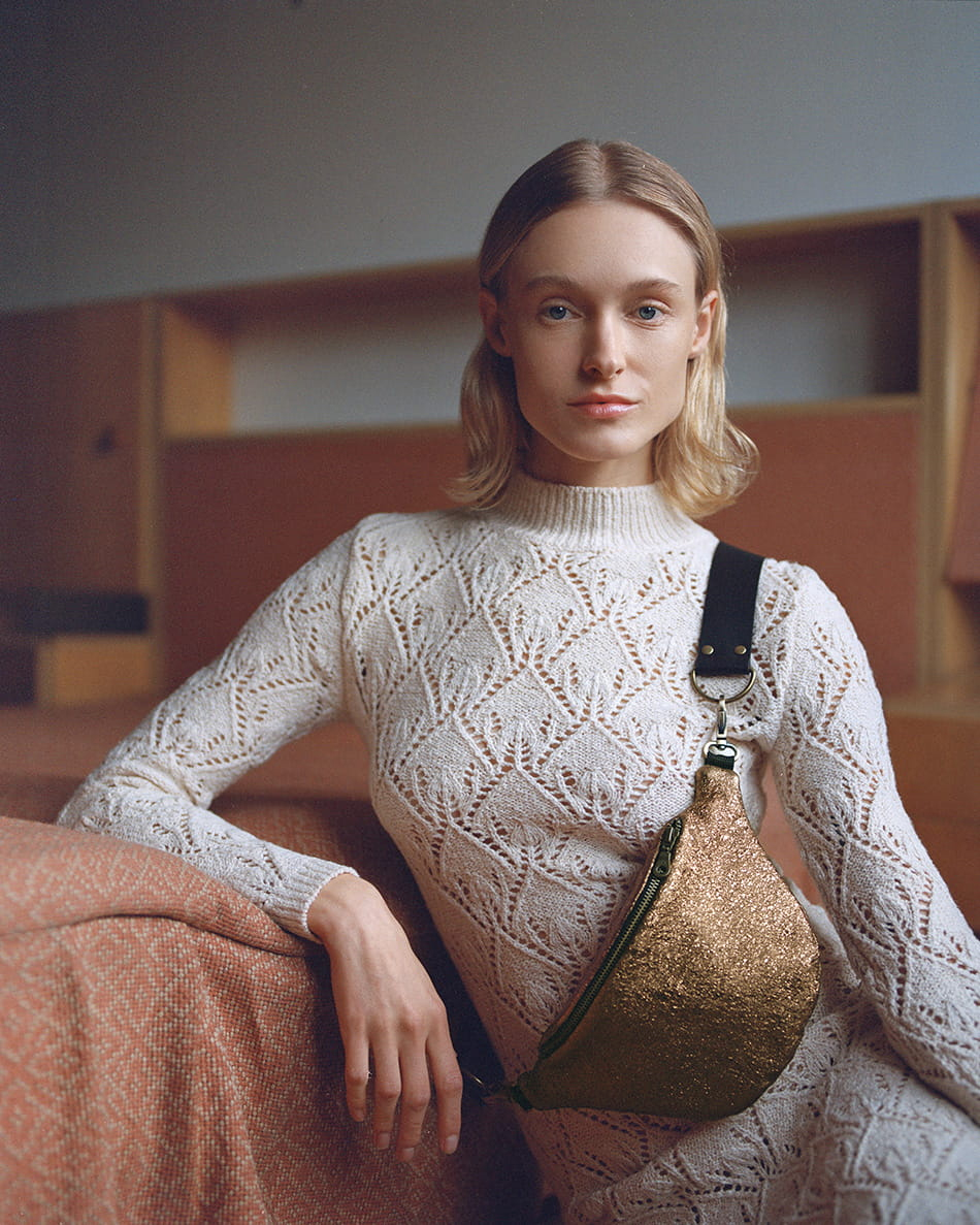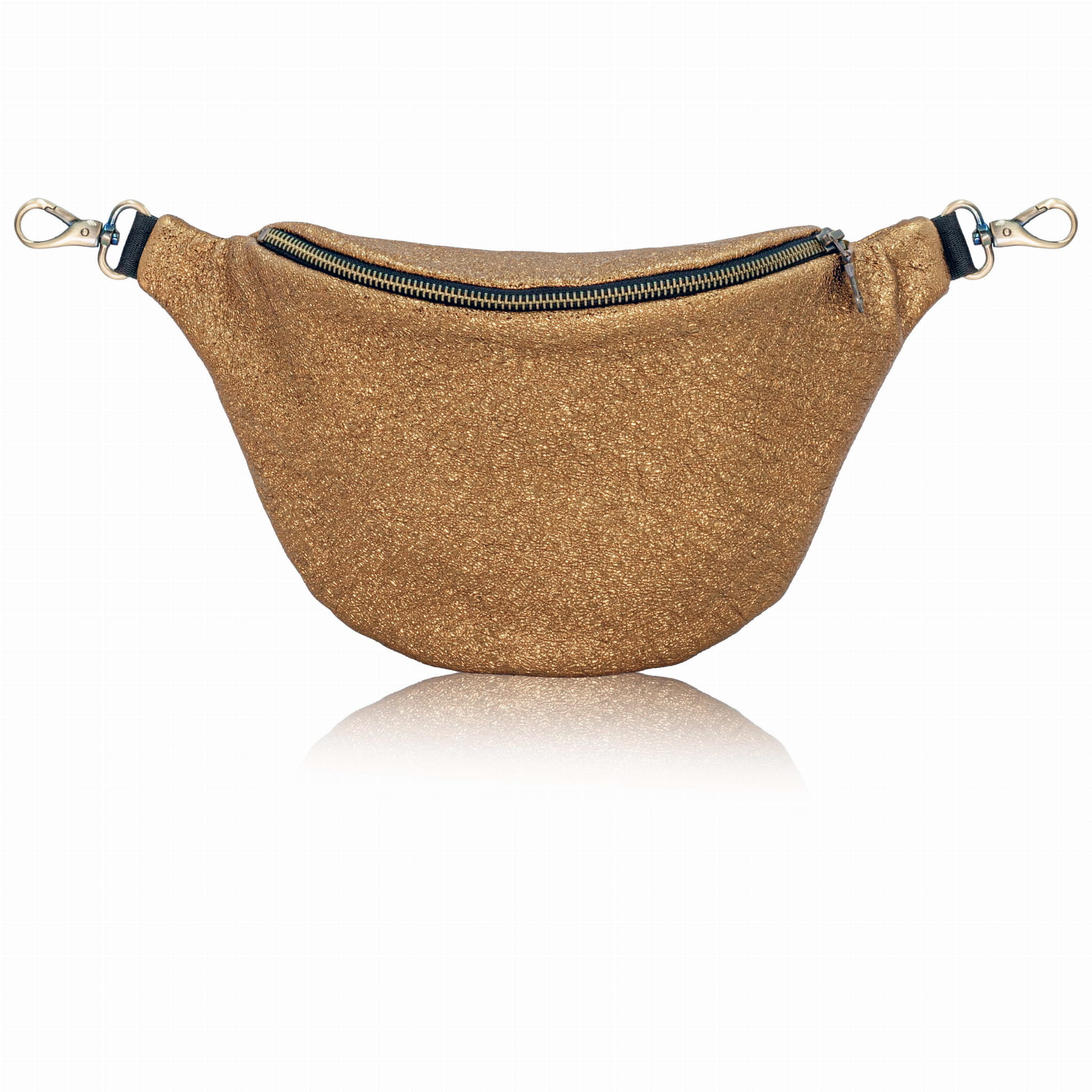 Nerka Brittle Gold Leather jest wykonana ze skóry naturalnej resztkowej. Jej wyraźne tłoczenie w połączeniu z metalizowanym, ciepłym odcieniem złota nadaje jej biżuteryjnego charakteru. Elementy metalowe w kolorze starego złota.